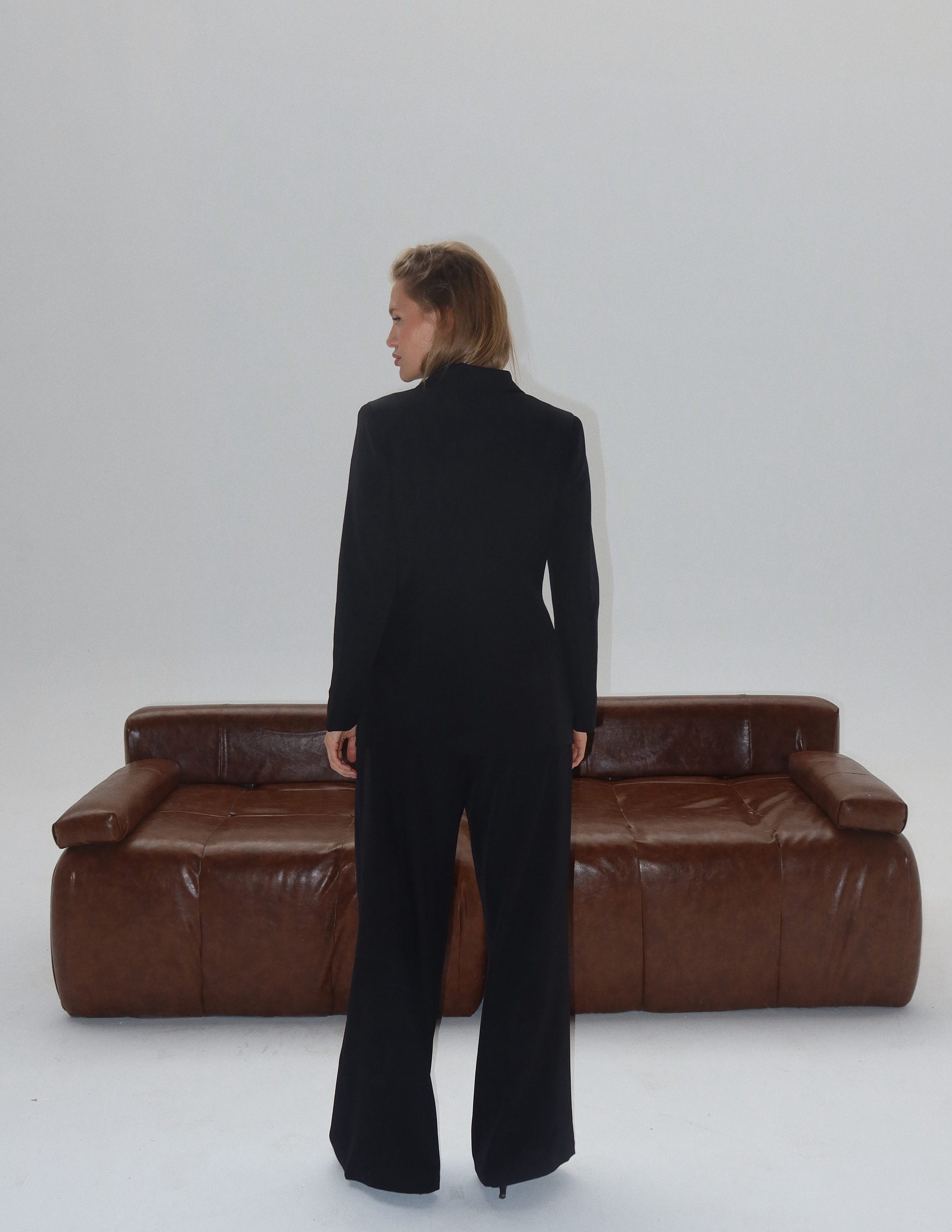 Female Model wearing pants size 36 and blazer size S/M.