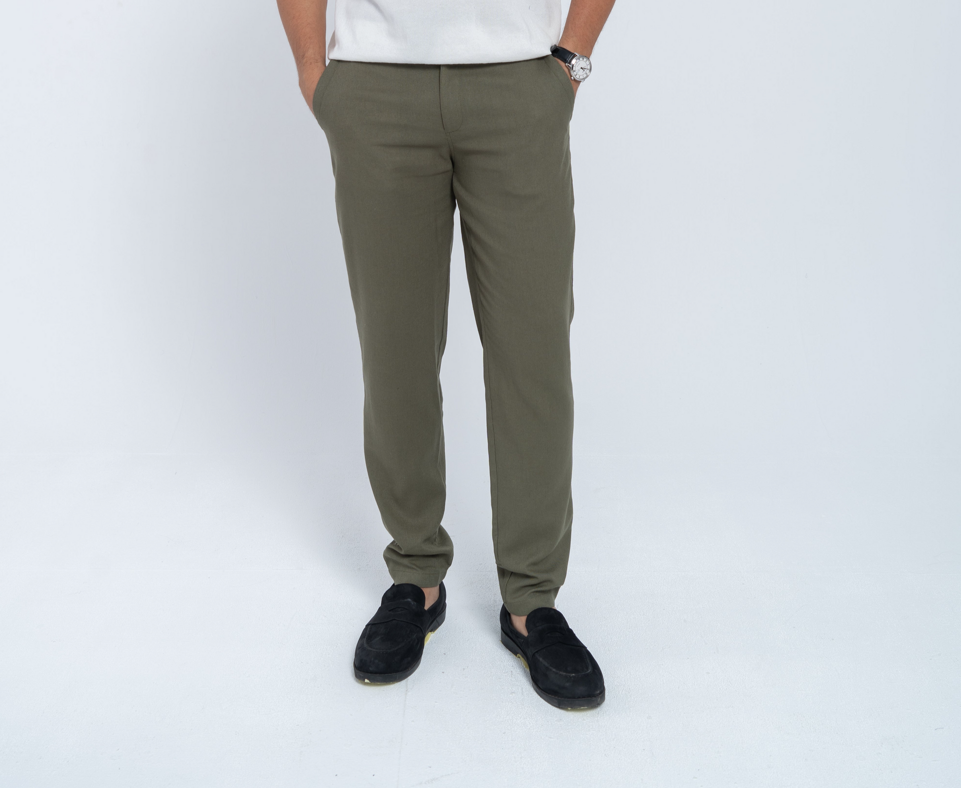 Straight fit pants made of pure linen. Elasticated waistband with adjustable drawstring. Front pockets and back welt pockets. Front zip fly and button fastening.