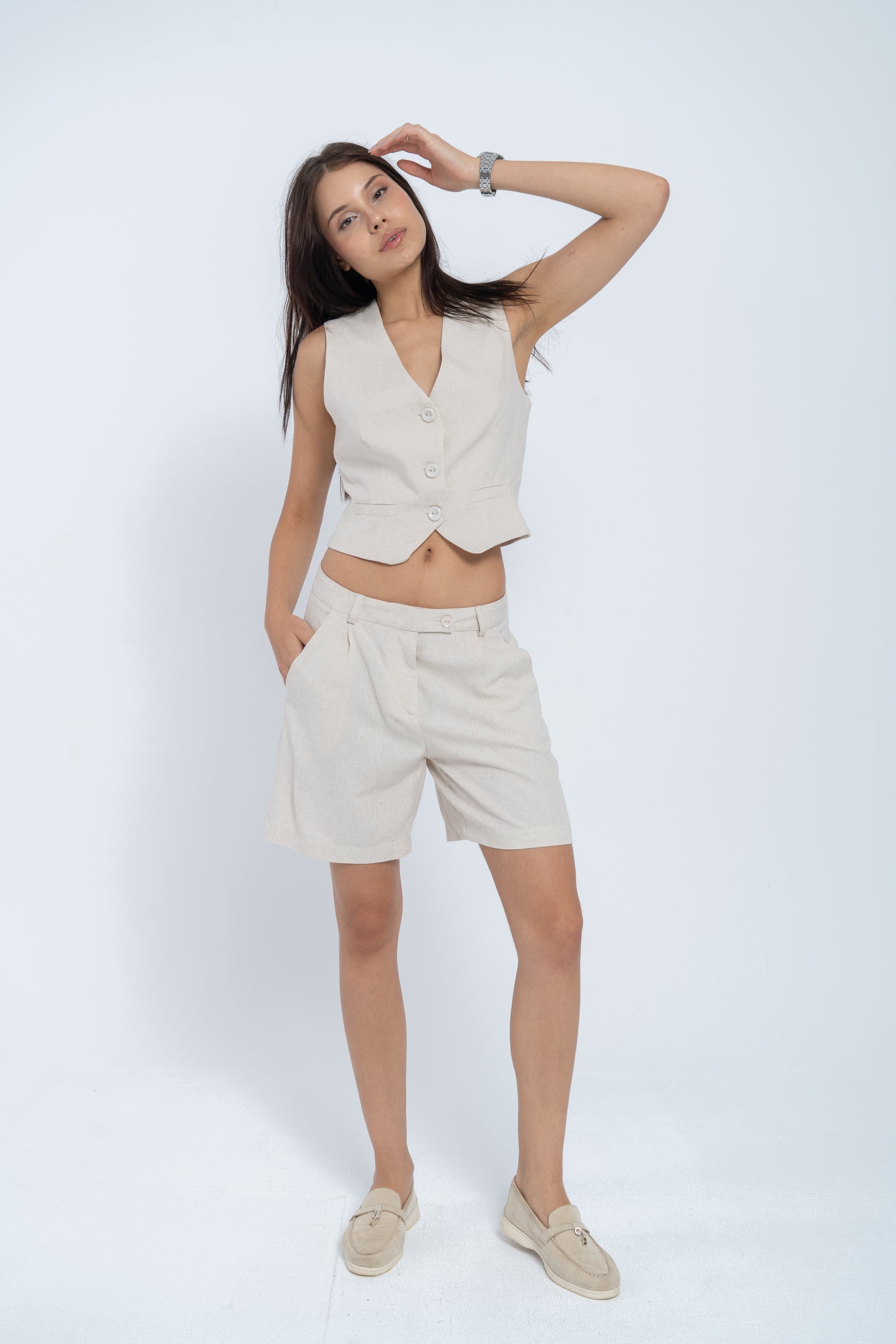 Low waist shorts made of linen. Front pockets. Front zip fly and button fastening.