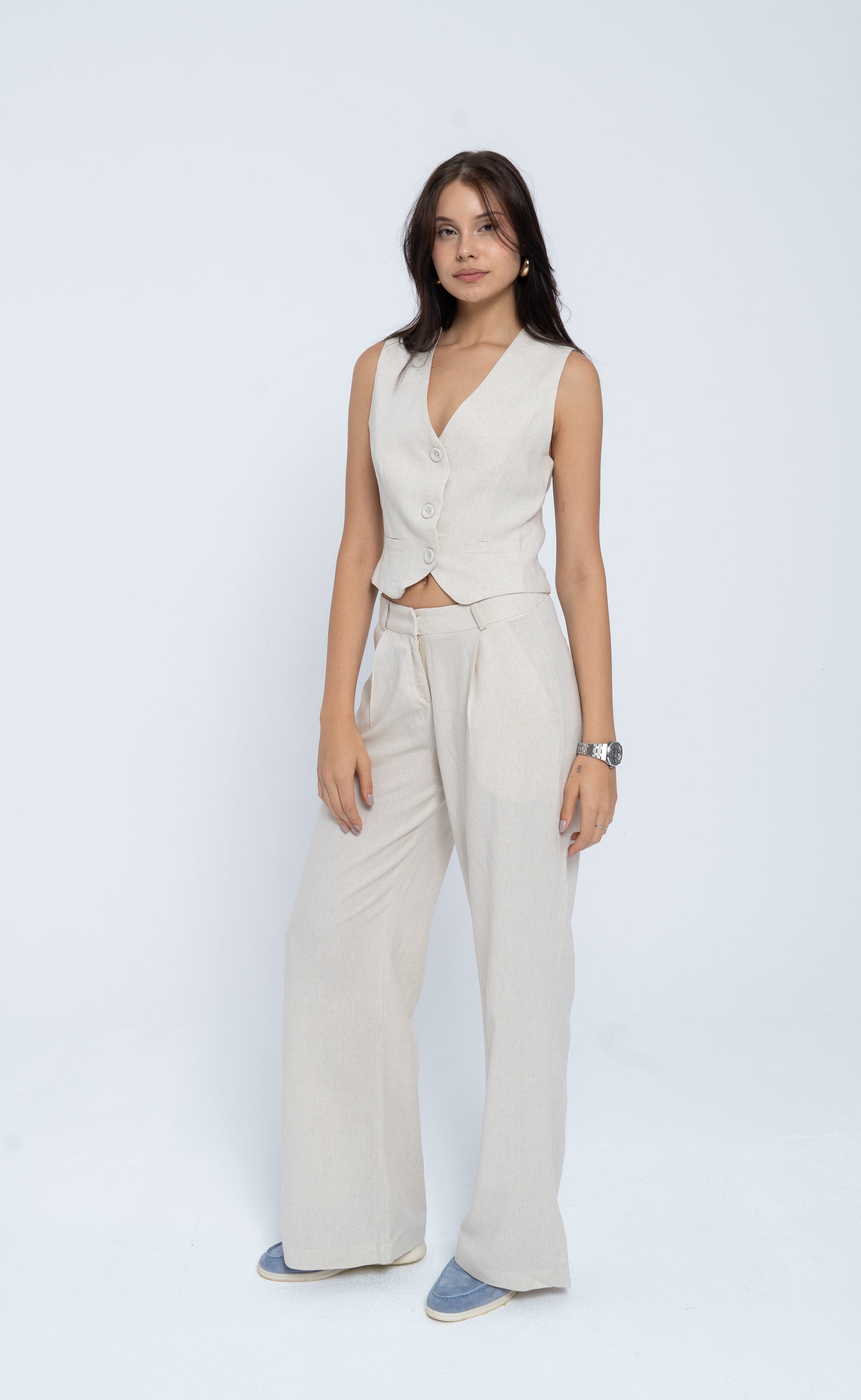 Fitted cropped Linen vest with a V-neck. False welt pockets on the front. Lining. Button-up front.